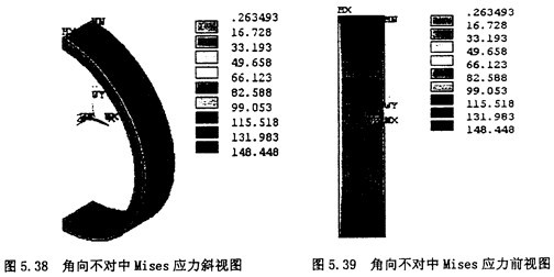 顯示節(jié)點(diǎn)的Von Mises應(yīng)力云圖:選擇Main Menu>General Postproc>Plot Result>NodalSolu,在彈出的對話框內(nèi)選擇“Stress”,第二欄內(nèi)選擇“Von Mises Stress,則其顯示的云圖如圖5,38,5.39所示