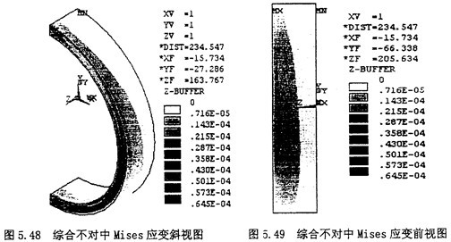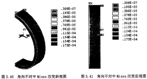 3.顯示節(jié)點(diǎn)的Von Mises應(yīng)變云圖:選擇Main Menu>General Postproc>Plot Result>NodalSolu,在彈出的對話框內(nèi)選擇“Strain”,第二欄內(nèi)選擇“Von Mises Strain”,則其顯示的云圖如圖5.48,5.49所示
