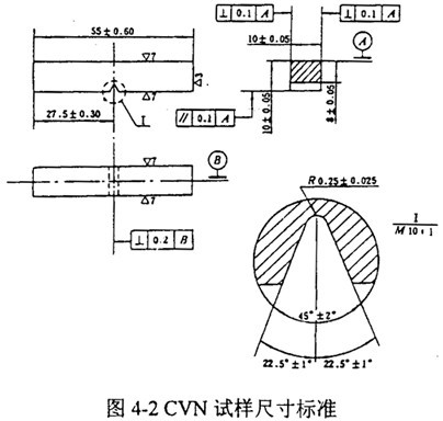 GB2106-80和ASMME23-96規(guī)定試樣標(biāo)準(zhǔn)尺寸為10×10×55mm,缺口深度為2mm。對(duì)于2/3尺寸試樣,厚度減為6.67mm,截面尺寸不變,如圖4-2。