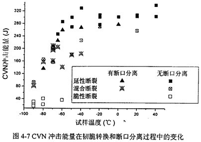 圖4-7選擇的管線鋼在實(shí)驗(yàn)溫度范圍內(nèi)同時(shí)經(jīng)歷了韌脆轉(zhuǎn)化和斷口分離,對(duì)上述結(jié)論給予了證實(shí),并可以看到發(fā)斷口分離的試件的韌性稍低于未發(fā)生斷口分離的試件。