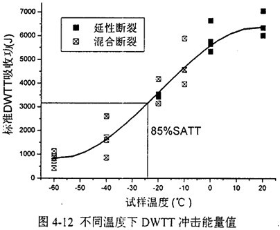 圖4-19顯示了標(biāo)準(zhǔn)壓制缺口DWTT試樣能量與實(shí)驗(yàn)溫度數(shù)據(jù)。