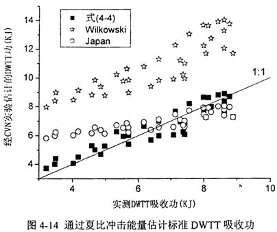圖4-14將(4.2)~(4.4)式預(yù)測(cè)的對(duì)應(yīng)關(guān)系同真實(shí)實(shí)驗(yàn)結(jié)果做了對(duì)比?梢钥吹綄(duì)于相近的CVN韌性預(yù)測(cè)結(jié)果,實(shí)際的DWTT功從低到高在大范圍內(nèi)分布。