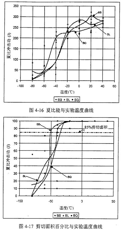 表4-3給出了歸納的夏比沖擊能量值及85%剪切面積對(duì)應(yīng)的轉(zhuǎn)變溫度。