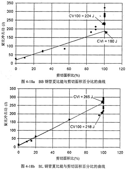 圖4-18a,b,c給出了三家鋼管的夏比能與剪切面積的關(guān)系,以及85%剪切面積對(duì)應(yīng)的轉(zhuǎn)變溫度。圖中CV100表示100%剪切面積時(shí)最低的夏比能,CVI表示最低夏比平臺(tái)能,也稱(chēng)夏比轉(zhuǎn)變能,CVP表示夏比平臺(tái)能。菱形實(shí)驗(yàn)點(diǎn)表示剪切面積高于90%,方形實(shí)驗(yàn)點(diǎn)表示低于90%可以看到,剪切面積低于90%時(shí),夏比能與剪切面積呈線性關(guān)系。