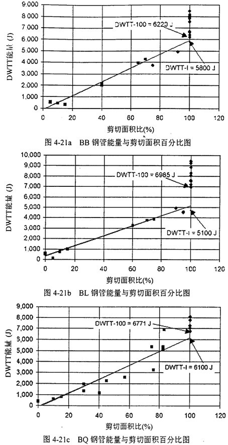 圖4-21a,b,c是能量與剪切面積百分比圖。和前面-樣,菱形實(shí)驗(yàn)點(diǎn)表示剪切面積高于90%,方形表示低于90%。與對(duì)CVN數(shù)據(jù)的處理類(lèi)似,分別定義DWTT-100表示100%剪切面積時(shí)最低的DWTT能,DWTT-I表示DWTT轉(zhuǎn)變能,DWTT-P表示DWTT平臺(tái)能。由圖4-21可確定DWTT和DWTT-100的值。