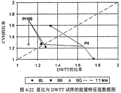 圖4-22是CVN與DWTT試樣的上臺(tái)能量特征值數(shù)據(jù)圖?偟膩(lái)說(shuō),CVN與DWTT試樣的特征能量比率有較好的一致性。圖中P/100的符合性比P/I更好,很大程度上是因?yàn)镃V100、DWTT-100比CVN-I、DWTT-I的獲得方法更為明確。