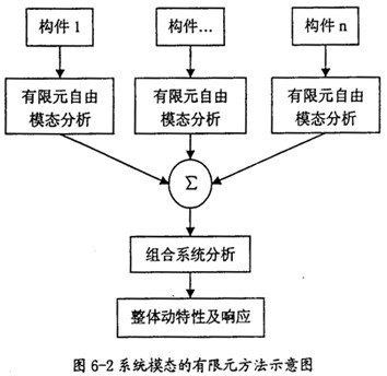 通過(guò)對(duì)系統(tǒng)中的各構(gòu)件進(jìn)行有限元自由模態(tài)分析,得到各構(gòu)件的自由模態(tài)(當(dāng)然也包含了6個(gè)剛體模態(tài)),以各構(gòu)件的連接關(guān)系為依據(jù),建立邊界條件,然后進(jìn)行模態(tài)綜合,即可計(jì)算得到整個(gè)系統(tǒng)的動(dòng)特性和響應(yīng)。其過(guò)程如圖6-2。