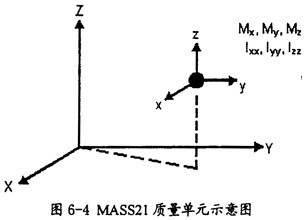 此單元為一個(gè)有六自由度的質(zhì)量單元。此單元的第一個(gè)不同的坐標(biāo)方向上可以施加不同的質(zhì)量大小和轉(zhuǎn)動(dòng)慣量。質(zhì)量單元是由單個(gè)節(jié)點(diǎn)、單元坐標(biāo)方向的集中質(zhì)量系數(shù)、單元坐標(biāo)軸的旋轉(zhuǎn)慣性所決定的。為了在加入質(zhì)量單元后不影響系統(tǒng)的慣性屬性,在此單元的實(shí)常數(shù)設(shè)定中慣性量應(yīng)設(shè)定的非常。ㄈ缧∮10-4)。單元如圖6-4所示。