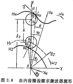 由上面可以看出,在選定激波器廓形TJ=TJ(θ)的情況下,正反兩種結(jié)構(gòu)所得到的內(nèi)齒圈齒廓方程式(2.21)與式(2.22)在形式上是不同的。對于反向結(jié)構(gòu),用-θ代換激波器方程中的θ,即令TJ=TJ(-θ),則θ增加的方向?yàn)轫槙r(shí)針方向,若激波器廓形可表示為偶函數(shù),即TJ(一θ)=TJ(θ),讓激波器按逆時(shí)針方向轉(zhuǎn)動,則所得的內(nèi)齒圈齒廓方程式完全與(2.21)式相同。因而齒廓方程式(2.22)與式(2.21)雖然形式不同,但實(shí)質(zhì)是一樣的。區(qū)別在于參數(shù)吸的取值方向,今后以式(2.21)作為內(nèi)齒圈齒廓的標(biāo)準(zhǔn)形式。