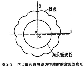 J上對應(yīng)點(diǎn)的坐標(biāo)值。一些點(diǎn)的計(jì)算數(shù)據(jù)如表2.2所示,由計(jì)算機(jī)繪出的激波器廓形如圖2.9所示,它并不是一個(gè)標(biāo)準(zhǔn)的圓,圖中圓的上部稍微有點(diǎn)凸出。由解的唯一性可推知,激波器為偏心圓的推桿減速器,其內(nèi)齒圈廓形一定不是擺線,雖然形狀相似,其實(shí)二者是不同的,這已為工程實(shí)際所證實(shí)。