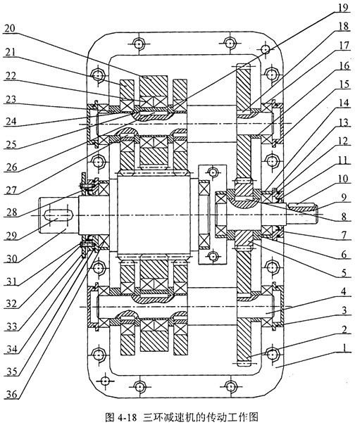 根據(jù)三環(huán)減速機(jī)的基本參數(shù)和結(jié)構(gòu)參數(shù),設(shè)計(jì)出三環(huán)減速機(jī)的傳動工作圖如圖4-18所示。