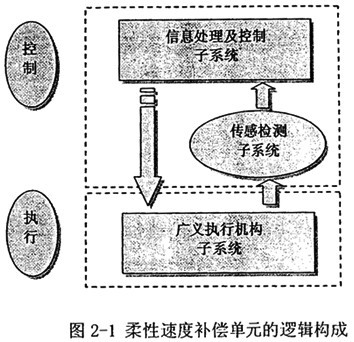 柔性速度補(bǔ)償單元由兩部分組成,包括機(jī)械運(yùn)動子系統(tǒng)、信息處理及控制子系統(tǒng),其中后者又包括信息處理與控制、傳感檢測兩部分。其邏輯組成如圖2-l所示。