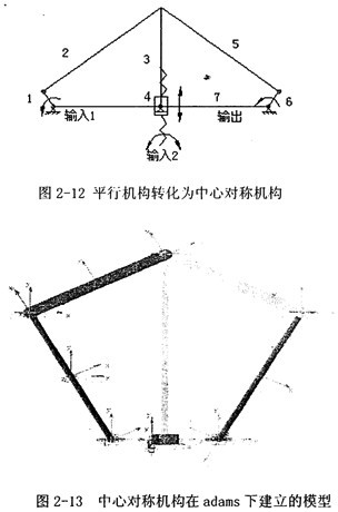 這種平行桿機(jī)構(gòu)理論上正確,但是實(shí)際上運(yùn)行時(shí)會產(chǎn)生奇異,不能實(shí)際采用,因此轉(zhuǎn)化為如圖2-12所示的這種中心對稱的連桿機(jī)構(gòu)。并在adams軟件下建立了模型如圖2-13,經(jīng)分析認(rèn)為該機(jī)構(gòu)完全對稱的結(jié)構(gòu)特征,更適合于一般情況下的速度等速傳遞,不適合在沖壓工況下應(yīng)用,所以這種結(jié)構(gòu)也決定不采用。
