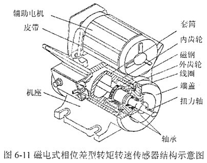 圖6-11為磁電式相位差型轉矩轉速傳感器的結構示意圖,它由機座、端蓋、扭力軸、內齒輪、外齒輪、磁鋼、線圈軸承等組成。內齒輪、磁鋼固定在套筒上,線圈固定在端蓋上,外齒輪固定在扭力軸上,當內外齒輪發(fā)生相對轉動時,由于磁通不斷變化,在線圈中便感應出近似正弦波的感應電勢ul、u2,兩感應電勢的初始相位差是恒定的,考慮到正反加載, 設計在大約180°位置上,當加上扭力時,扭力軸發(fā)生扭轉變形,在彈性范圍內外加扭矩與機械扭轉角成正比,這時ul、u2訊號的相位差要發(fā)生變化,即
