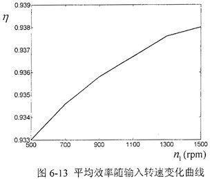 進行減速器效率試驗前,首先讓減速器在輸入轉速為500rpm的條件下,空載跑合4個小時,觀察運轉正常后,進入試驗的準備階段。為測得準確試驗數據必項對轉矩轉速測量儀進行常數輸入和轉矩調零設置,一切準備完畢后,開始對減速器進行試驗測試。當輸入軸轉速取不同值時計算出減速器樣機的傳動比及樣機總評傳動比如表6-1所示,通過分析測試數據可知,經實測最大的傳動比誤差為-0.0148,平均傳動比誤差為-0.0078。表明樣機的傳動比準確,傳動精度高。經分析可知,正弦滾道的加工精度是造成整機傳動誤差的主要原因。