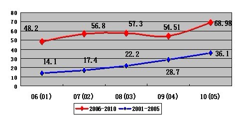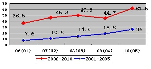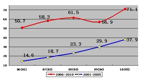 2006年至20010年雖然總量有較大的增長(zhǎng),但增長(zhǎng)速度趨緩。