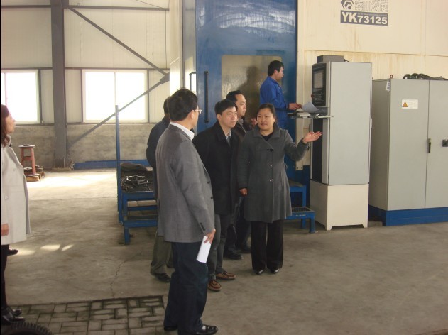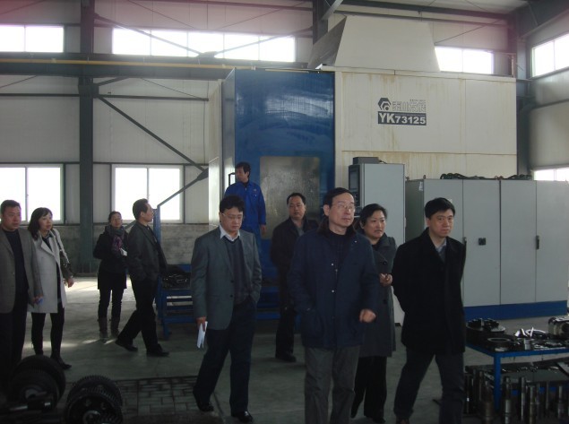 韓祝強(qiáng)縣長(zhǎng)、張軍會(huì)長(zhǎng)、劉占坤總經(jīng)理在大型數(shù)控磨齒機(jī)旁