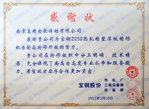 最終,在南高齒生產(chǎn)和技術(shù)部門的緊密配合下,經(jīng)過一個月的緊張搶修,南高齒比寶鋼要求的3月21日,提前一天完成了齒輪箱的修復(fù),受到寶鋼有關(guān)領(lǐng)導(dǎo)部門的表彰。