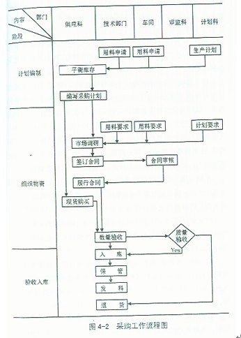 為明確各方面責(zé)任,公司從提出用料申請、編制物資采購計劃開始,到驗收入庫、生產(chǎn)使用為止,制定了詳細(xì)的業(yè)務(wù)流程,所有環(huán)節(jié)一律按工作程序進行全程管理。詳見圖4—2采購工作流程圖。