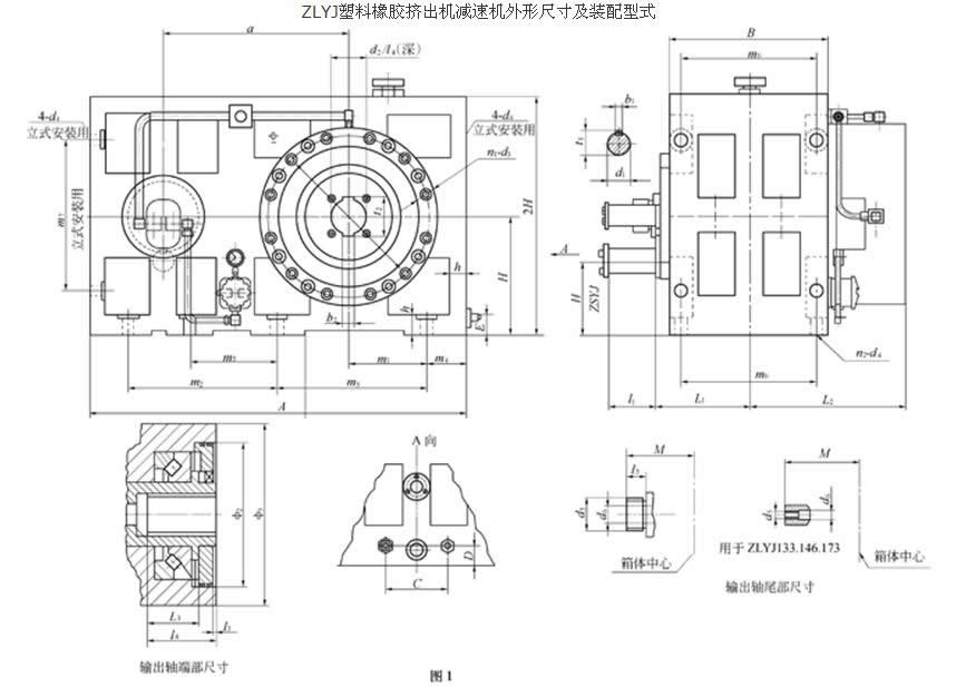 適用條件 1、減速機(jī)高速軸轉(zhuǎn)速不大于1500r/min。 2、齒輪傳動(dòng)圓周速度不大于20m/s。 3、工作環(huán)境溫度為-40~+45℃。如果低于0℃,啟動(dòng)前潤(rùn)滑油應(yīng)預(yù)熱至0℃以上,當(dāng)溫度超出規(guī)定時(shí),可按用戶要求,另行配置潤(rùn)滑加熱或冷卻裝置。本減速機(jī)可用于正反兩個(gè)方向運(yùn)轉(zhuǎn),但部分機(jī)型高速軸帶單向油泵,默認(rèn)方向?yàn)椋好鎸?duì)輸出軸,輸出軸為順時(shí)針旋轉(zhuǎn)。如方向改變,請(qǐng)?jiān)谟嗀洉r(shí)說明。 本機(jī)廣泛應(yīng)用在單螺桿擠出機(jī):塑料管材、板材機(jī)組、吹膜機(jī)組、造顆粒機(jī)組、電纜機(jī)組、注塑機(jī)組等。橡膠擠出機(jī)。以及食品擠出機(jī)械。 花鍵、方孔、六方孔以及出軸頭的方頭、圓頭等(需要訂做)規(guī)格φ2(H7) l3 φ3 d4 n2 m1 m2 m3 m4 m5 m6 m7 C D E d5 d6 l5 M ZLYJ112 160 8 210 14 4 96 326 50 136 170 M16 18 125 ZLYJ133 180 8 230 16 6 104 185 185 61 180 184 M18 20 137 ZLYJ146 200 8 260 16 6 118 190 235 72 210 210 85 38 ZG1/2″ M18 20 167 ZLYJ173 230 8 300 18 6 113.5 220 220 68 225 214 m20 25 167 ZLYJ200 270 8 350 18 6 150 275 275 100 290 310 120 40 m85*4 40 50 250 ZLYJ225 330 8 420 26 6 165 310 310 90 315 330 140 50 55 265 ZLYJ250 330 8 420 26 6 205 360 360 105 330 340 160 50 285 ZLYJ280 360 8 450 30 6 200 385 385 100 355 380 160 50 300 ZLYJ315 365 8 450 30 6 260 450 450