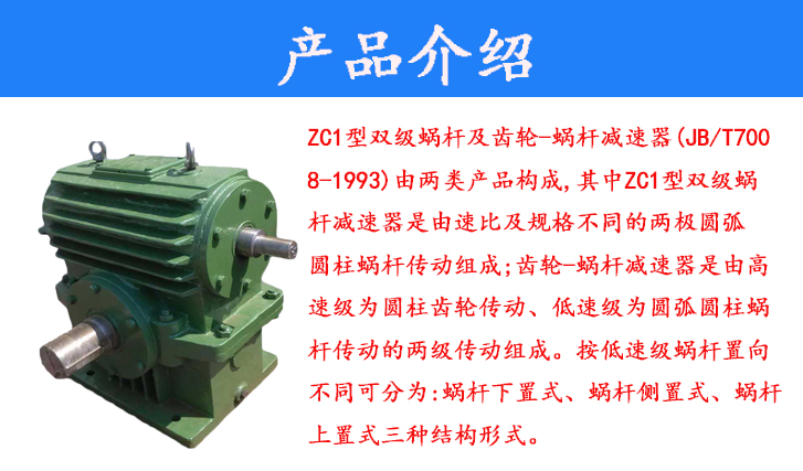 ZC1型雙級蝸桿及齒輪-蝸桿減速器(JB/T7008-1993)由兩類產(chǎn)品構(gòu)成,其中ZC1型雙級蝸桿減速器是由速比及規(guī)格不同的兩極圓弧圓柱蝸桿傳動組成;齒輪-蝸桿減速器是由高速級為圓柱齒輪傳動、低速級為圓弧圓柱蝸桿傳動的兩級傳動組成。