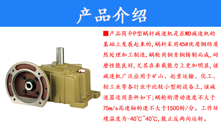 P型蝸桿減速機(jī)是在WD減速機(jī)的基礎(chǔ)上發(fā)展起來(lái)的,蝸桿采用45#優(yōu)質(zhì)鋼經(jīng)質(zhì)然處理加工制造,蝸輪用銅青銅鑄制而成,耐磨性能良好,尤其在承載能力上更加明顯,該減速機(jī)廣泛應(yīng)用于礦山、起重運(yùn)輸、化工、輕工業(yè)等各行業(yè)中比較小型的設(shè)備上,該減速器適用條件如下;蝸輪的滑動(dòng)速度不大于75m/s高速軸的速不大于1500轉(zhuǎn)/分。工作環(huán)境溫度為-40℃~40℃,能正反兩向運(yùn)轉(zhuǎn)。