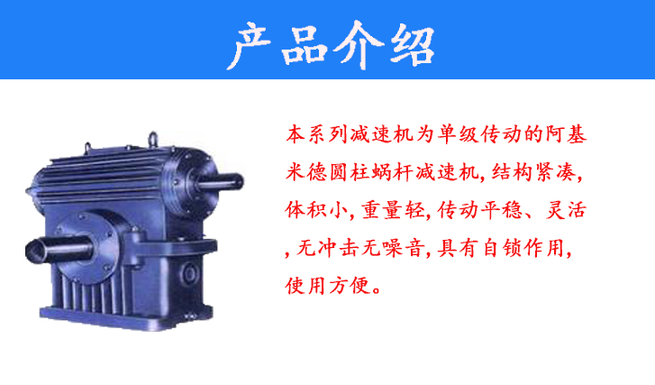 本系列減速機為單級傳動的阿基米德圓柱蝸桿減速機,結構緊湊,體積小,重量輕,傳動平穩(wěn)、靈活,無沖擊無噪音,具有自鎖作用,使用方便。
