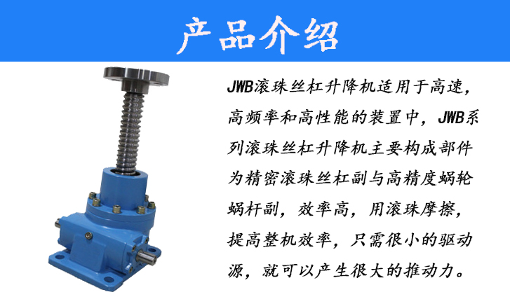 JWB滾珠絲杠升降機適用于高速、高頻率和高性能的裝置中,JWB系列滾珠絲杠升降機主要構成部件為精密滾珠絲杠副與高精度度蝸輪蝸桿副,效率高,用滾珠摩擦,提高整機效率,只需很小的驅動源,就可以產(chǎn)生很大的推動力。