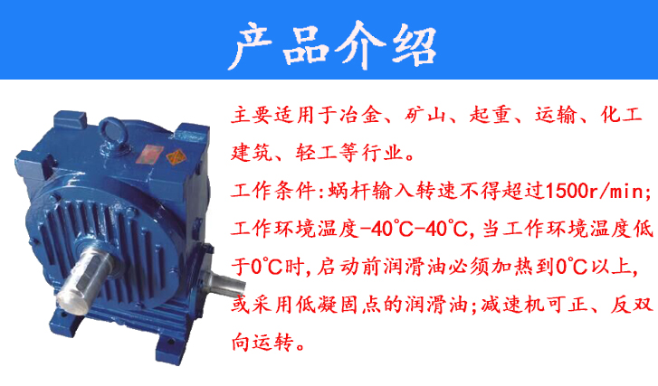 主要適用于冶金、礦山、起重、運(yùn)輸、化工建筑、輕工等行業(yè)。工作條件:蝸桿輸入轉(zhuǎn)速不得超過1500r/min;工作環(huán)境溫度-40℃-40℃,當(dāng)工作環(huán)境溫度低于0℃時(shí),啟動(dòng)前潤(rùn)滑油必須加熱到0℃以上,或采用低凝固點(diǎn)的潤(rùn)滑油;減速機(jī)可正、反雙向運(yùn)轉(zhuǎn)。