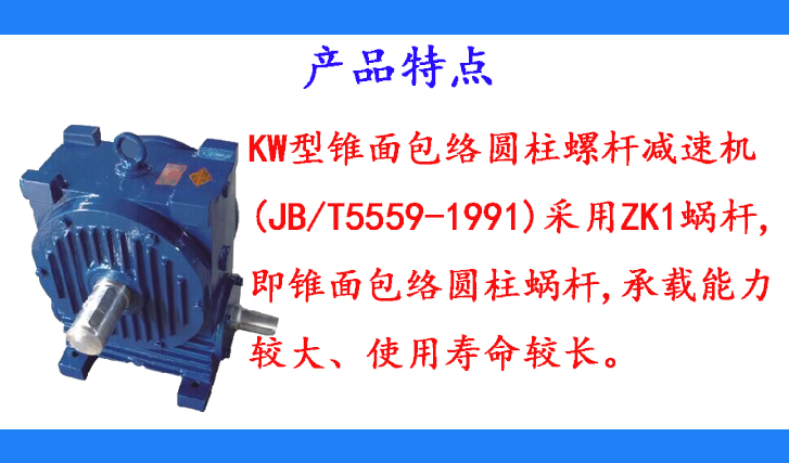 KW型錐面包絡(luò)圓柱螺桿減速機(jī)(JB/T5559-1991)采用ZK1蝸桿,即錐面包絡(luò)圓柱蝸桿,承載能力較大、使用壽命較長(zhǎng)。