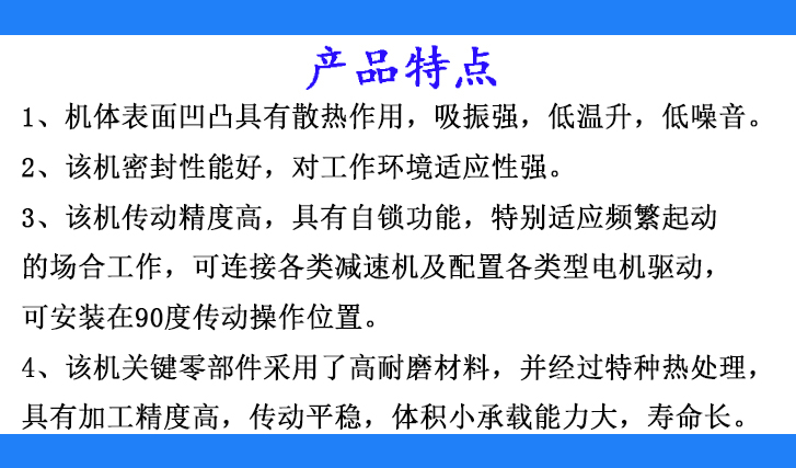 3、該機傳動精度高,特別適應在有頻繁啟動的場合工作,可連接各類減速機及配置各類型電機驅(qū)動,可安裝在90°傳動操作位置。