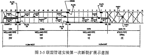 為了驗(yàn)證聯(lián)盟管道Φ914和Φ1067鋼管的止裂韌性,進(jìn)行了兩組全尺寸爆破實(shí)驗(yàn),實(shí)驗(yàn)管段全長約366m,中間為9根11m長的實(shí)驗(yàn)樣管,爆破實(shí)驗(yàn)時(shí)裂紋將在其中進(jìn)行擴(kuò)展。實(shí)驗(yàn)樣管沿東西方向分別標(biāo)為1E、2E以及1W、2W等,預(yù)制裂紋穿過1E和1W之間的環(huán)焊縫。第一次實(shí)驗(yàn)的示意圖如圖3-5所示。