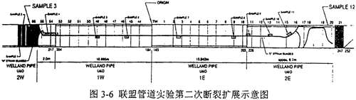 實(shí)驗(yàn)二的斷口均為剪切斷裂,裂紋擴(kuò)展長度為33.6m。由于1W和1E沖擊功低于預(yù)測的止裂沖擊韌性,因而裂紋均沿1W和lE軸向直線擴(kuò)展并分別進(jìn)入2W和2E樣管,最后在2W和2E樣管中止裂,如圖3-6所示。
