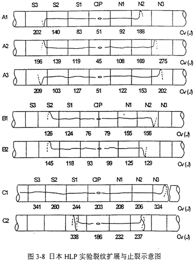 表3-2日本HLP管道爆破實(shí)驗(yàn)各段CVN與DWTT吸收功(單位:J)