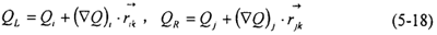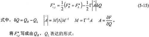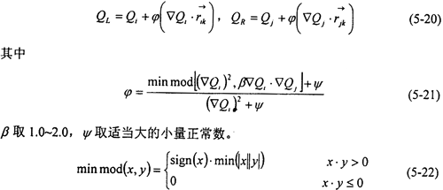但是,由(5-18)直接得到的格式在激波附近是不穩(wěn)定的,將會出現(xiàn)非物理振蕩。迎風(fēng)格式通過限制物理量的梯度值,來保證物理量在單元內(nèi)的分布具有單調(diào)性,從而達(dá)到抑制間斷附近非物理振蕩的目的。這時,(5-18)式變?yōu)?/p>