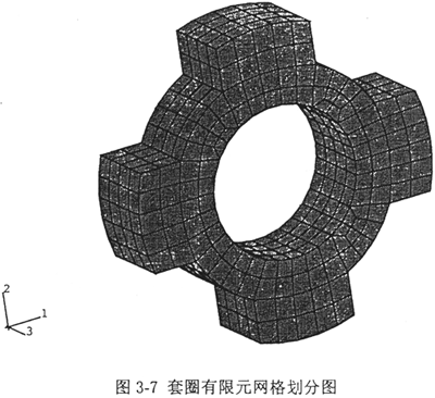 套圈是一個(gè)不規(guī)則的零件,先用有限元按三維八節(jié)點(diǎn)實(shí)體單元對(duì)它進(jìn)行網(wǎng)格劃分,圖3-7是有限元網(wǎng)格劃分圖。邊界條件是這樣處理的:由于套圈裝在減速機(jī)箱體孔中時(shí),和孔的配合是過(guò)盈配合,且套圈內(nèi)表面與傳動(dòng)軸外表面也是過(guò)盈配合,故套圈的配合面處均按固支對(duì)待。經(jīng)ABAQUS有限元軟件處理后輸出質(zhì)量矩陣和剛度矩陣,然后用廣義的Collatz包含定理求出它的低階固有頻率。