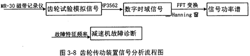 圖3-8是齒輪傳動(dòng)裝置信號(hào)分析流程圖,用HP3562動(dòng)態(tài)數(shù)字分析儀采集MR-30磁帶記錄儀紀(jì)錄的二級(jí)圓柱斜齒輪減速機(jī)試驗(yàn)過(guò)程中的模擬信號(hào),可得到齒輪傳動(dòng)裝置載荷、齒輪傳動(dòng)裝置箱體動(dòng)態(tài)激勵(lì)力應(yīng)變變化的時(shí)域信號(hào),對(duì)此信號(hào)作FFT變換,可得到載荷譜和動(dòng)態(tài)激勵(lì)力應(yīng)變變化時(shí)域信號(hào)的功率譜。為了防止功率譜泄露,在作FFT變換時(shí),需作加窗處理,由于試驗(yàn)采集的是隨機(jī)信號(hào),故加漢寧(Hanning)窗處理。利用故障診斷特征參數(shù)-傳動(dòng)零件可能發(fā)生故障的振動(dòng)頻率及其振動(dòng)頻率處的功率對(duì)試驗(yàn)信號(hào)進(jìn)行診斷分析。當(dāng)功率譜所包含的頻率成份難以區(qū)分時(shí),可采用倒譜分析。