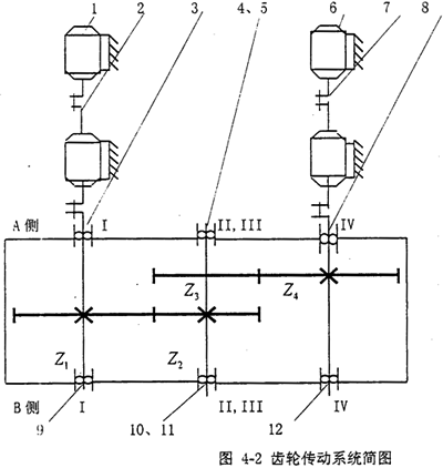 軋機減速機是軋鋼廠的動力傳輸裝置,它起到減速(粗軋時)和增速(精軋時)的作用。它一般由兩對斜齒輪、若干個調(diào)心滾子軸承和箱體組成。圖4-2是減速機機組的機構(gòu)運動簡圖,在該圖中,軸III在軸II的正下方。
