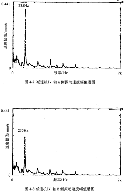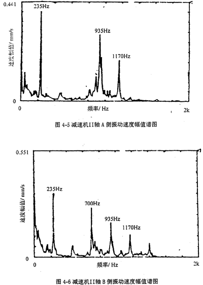 圖4-3、4-4分別是把振動加速度計放在減速機I軸A側(cè)和B側(cè)軸承座上所測得振動速度幅值譜圖;圖4-5、4-6分別是把振動加速度計放在減速機II軸A側(cè)和III軸B側(cè)軸承座上所測得振動速度幅值譜圖;圖4-7、4-8分別是把振動加速度計放在減速機IV軸A側(cè)和B側(cè)軸承座上所測得振動速度幅值譜圖。