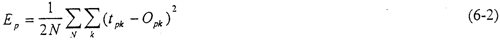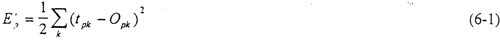 前饋網(wǎng)絡(luò)的訓(xùn)練學(xué)習(xí)是一種監(jiān)督學(xué)習(xí),而監(jiān)督學(xué)習(xí)的范例要求每一個輸入模式矢量與表示所期望的輸出模式矢量必須配對。一般說來,網(wǎng)絡(luò)輸出值{OPK}與期望的輸出值{tPK}是不相等的。對每一個輸入模式的模式樣本,其平方誤差為: