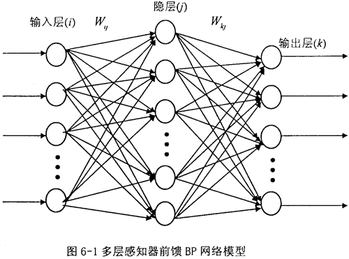 BP算法即是誤差反傳訓(xùn)練算法,它是一種有導(dǎo)師的訓(xùn)練算法,它在給定輸出目標(biāo)的情況下,按其實際輸出與目標(biāo)值之差的平方和為目標(biāo)函數(shù),通過調(diào)節(jié)權(quán)值使目標(biāo)函數(shù)達到最小值。多層感知器前饋BP網(wǎng)絡(luò)模型如圖6-1所示。