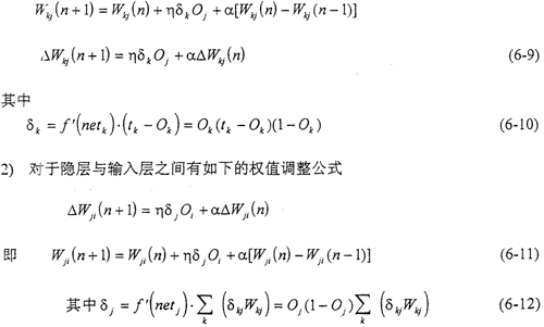 對于圖6-1所示的網(wǎng)絡(luò),其訓(xùn)練學(xué)習(xí)的過程包括:1)網(wǎng)絡(luò)內(nèi)部的前向計算;2)誤差的反向傳播。其主要目的就是通過逐步調(diào)整網(wǎng)絡(luò)的內(nèi)部連接權(quán)值,使網(wǎng)絡(luò)的均方誤差達到我們的要求。網(wǎng)絡(luò)內(nèi)部的連接權(quán)值的調(diào)整,都是采用推廣的δ規(guī)則來完成的。