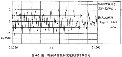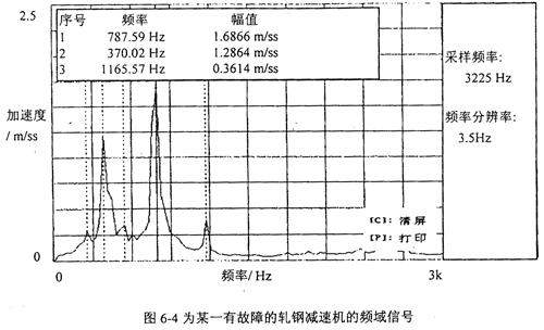 由于減速機(jī)故障樣式的多樣性,故它的故障標(biāo)準(zhǔn)模式樣本的建立是比較困難的,需進(jìn)行大量的試驗(yàn)研究和實(shí)際設(shè)備故障診斷的總結(jié)和歸納。表6-5是在參考其它學(xué)者研究成果的基礎(chǔ)上,總結(jié)設(shè)備具體工作情況得出的減速機(jī)的故障標(biāo)準(zhǔn)模式樣本,表6-6為減速機(jī)標(biāo)準(zhǔn)訓(xùn)練樣本的訓(xùn)練結(jié)果(網(wǎng)絡(luò)規(guī)模為:輸入層節(jié)點(diǎn)數(shù)為:9個(gè);一個(gè)隱層節(jié)點(diǎn)數(shù)為:40個(gè);輸出層節(jié)點(diǎn)數(shù)為9個(gè);誤差精度為10-5,網(wǎng)絡(luò)迭代次數(shù)為5217次)。圖6-3為某一有故障的軋鋼減速機(jī)的時(shí)域信號(hào),圖6-4為頻域信號(hào)。對(duì)圖6-4的頻域信號(hào)進(jìn)行歸一化處理,可得待識(shí)別的故障樣本,用訓(xùn)練好的網(wǎng)絡(luò)對(duì)該樣本進(jìn)行識(shí)別。表6-7為該減速機(jī)故障樣本的識(shí)別結(jié)果。fa一軸頻,f0一軸承外圈故障特征頻率,fi一軸承內(nèi)圈故障特征頻率,fb一軸承滾動(dòng)體故障特征頻率,fmeh一齒輪嚙合頻率。