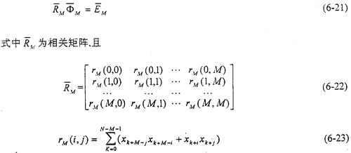 根據(jù)自相關(guān)矩陣的特點(diǎn),可將相關(guān)矩陣(6-22)式表示為Toeplity矩陣和Hankel矩陣相乘,使求解AR(M)模型參數(shù)M,j(j=1,2,…,M)的計(jì)算工作量為NM+O(M2)次運(yùn)算。其中N為輸入數(shù)據(jù)長度,M為AR模型的階數(shù),O(M2)為最高次數(shù)為2的代數(shù)式。