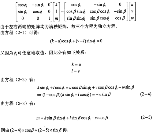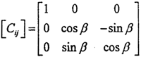 如圖2-21所示,坐標(biāo)系OXjYjZj可以看作是坐標(biāo)系OXiYiZi繞Xi(或Xj)旋轉(zhuǎn)了一個(gè)角β度。旋轉(zhuǎn)的方向余弦矩陣為: