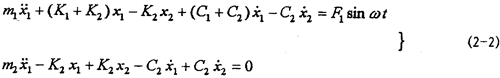 對應(yīng)的力學(xué)模型如圖2-3(見22頁)所示,式中m1為振動臺動圈、聯(lián)軸器外套及固定在振動臺上夾具的質(zhì)量;m2為聯(lián)軸器內(nèi)套、芯軸及配重的質(zhì)量;K1為振動臺支撐動圈部分的剛度系數(shù),K2為聯(lián)軸器彈性元件的剛度系數(shù);C1為振動臺動圈阻尼系數(shù);C2為聯(lián)軸器