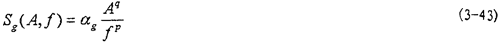 對(duì)于(3-22)模型,我們用阻尼耗能的能量關(guān)系來(lái)辨識(shí)阻尼力與振幅和頻率的關(guān)系。在前面,遲滯回線面積(即阻尼耗能)與振幅的函數(shù)關(guān)系已建立起來(lái),見(jiàn)(3-38)式,而且式中參數(shù)也已辨識(shí)出。同樣,用數(shù)值積分,可以算出振幅一定,頻率變化時(shí)遲滯回線的面積,由此得出遲滯回線面積與頻率的對(duì)應(yīng)關(guān)系,將這些對(duì)應(yīng)關(guān)系畫(huà)成曲線如圖3-6中大圓點(diǎn)曲線所示。由遲滯回線面積隨頻率變化的規(guī)律分析,可建立其函數(shù)關(guān)系為: