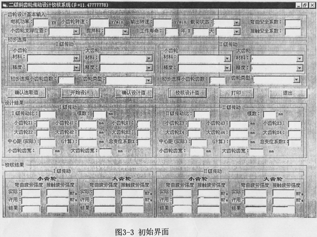 在這三類參數(shù)中,用戶參數(shù)是要由用戶給定,齒輪特性參數(shù)是要得到的結(jié)果,齒輪設(shè)計(jì)參數(shù)是一種中間描述參數(shù),它需要通過一系列的復(fù)雜的計(jì)算求解,而齒輪設(shè)計(jì)的科學(xué)性也就是通過對(duì)齒輪設(shè)計(jì)參數(shù)的精確確定而實(shí)現(xiàn)的,具體計(jì)算機(jī)實(shí)現(xiàn)公式見3.6-3.8;齒輪的接觸強(qiáng)度與彎曲強(qiáng)度校核分別見3.3和3.4。系統(tǒng)的參數(shù)初始輸入界面見圖3-3。