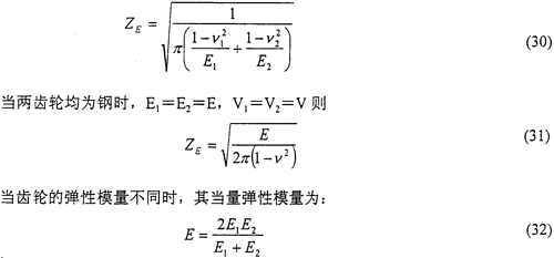 彈性系數(shù)ZE是用以考慮霉?fàn)彈性模量E和泊桑比v對(duì)赫茲應(yīng)力的影響。其數(shù)值可按實(shí)際材料彈性模量E和泊桑比v由式(30)計(jì)算得出。
