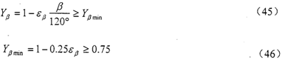 螺旋角系數(shù)Yβ是考慮螺旋角造成的接觸線傾斜對(duì)齒根應(yīng)力產(chǎn)生影響的系數(shù)。其數(shù)值可以通過(guò)式(45)和(46)計(jì)算。